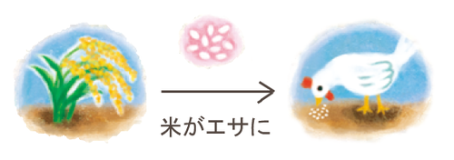 親鶏の飼料には国産の飼料用米を配合しています。白玉の親鶏には5%、赤玉には10%給餌し、日本の農業を応援しています。