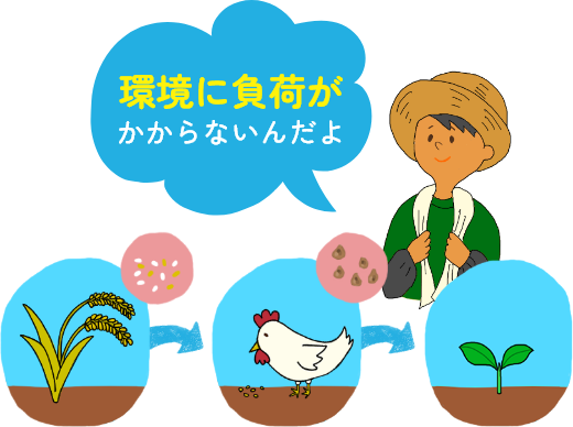 エサにするお米の栽培には、「はぐくみ鶏」の養鶏場から出る排泄物を活用した有機質肥料が使われています。この有機質肥料には、植物の成長に欠かせない栄養がたっぷり含まれています。