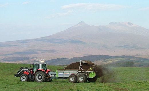 北海道・函館の大自然に囲まれた大型の牛舎で、のびのび育てられている「小澤さんちのはこだて大沼牛」。ここでは、牛の健康を考えて、自然堆肥を使って栽培した牧草と飼料用トウモロコシをたっぷりと与えています。牧場内で牛の排泄物を堆肥化すると、化学肥料の使用は通常の3分の1になります。