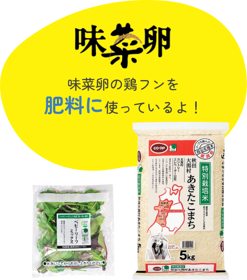 例えば…秋田大潟村あきたこまちやベビーリーフミックスは、味菜卵の鶏フンを肥料に使っています。